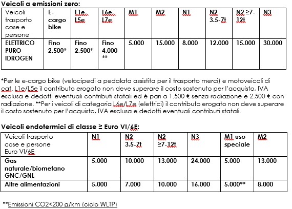 È previsto CONTRIBUTO A FONDO PERDUTO variabile da un min di 2.500 € fino ad un max di 30.000 € in base alla categoria, alla classe emissiva e al livello di emissioni prodotte (vedi tabelle).